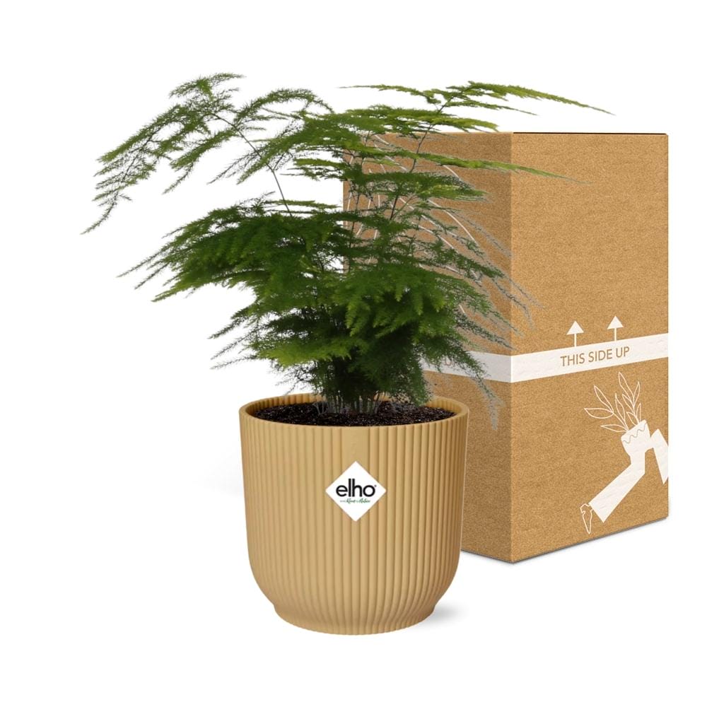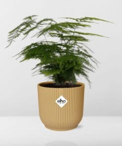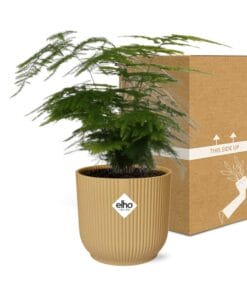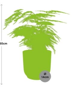 Om goed voor de Asparagus Fern te zorgen, is het belangrijk om hem een plekje te geven in de halfschaduw of in de schaduw, aangezien hij indirect licht verkiest. Het is voldoende om één keer per week water te geven om de plant gezond te houden, waarbij de grond licht vochtig moet zijn maar niet overdreven verzadigd. De Asparagus Fern gedijt het beste in goed doorlatende grond. Voor optimale groei wordt aanbevolen om de plant eens per maand tijdens de lente- en zomermaanden te bemesten met een evenwichtige vloeibare meststof. Deze mooie plant kan genoten worden in een sierpot en voegt een vleugje groen toe aan elke ruimte.