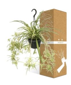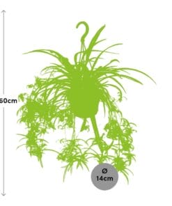 De Chlorophytum comosum Variegatum, liefkozend bekend als de Spinnenplant, is een prachtige keuze voor binnenbeplanting. Afkomstig uit Zuid-Afrika, voegt deze plant een elegante touch toe aan elke ruimte. Met zijn langwerpig, gevlekte bladeren die op een waaierachtige manier naar beneden hangen, versterkt hij moeiteloos uw interieur. De Spinnenplant is geliefd vanwege zijn luchtzuiverende eigenschappen, waardoor het een gezonde, natuurlijke toevoeging is aan uw binnenomgeving. Het is gemakkelijk te verzorgen en gedijt goed bij indirect zonlicht en regelmatig water geven. Verlicht uw huis met de betoverende en bekende Spinnenplant, perfect voor plantenliefhebbers van alle niveaus. Op zoek naar een moeiteloos charmante toevoeging aan je binnen tuin? Zoek niet verder dan Chlorophytum comosum Variegatum! Ook bekend als de bonte graslelie, gedijt deze schoonheid in een plek met halfschaduw of indirect zonlicht. Met zijn prachtige groene en wit gestreepte bladeren voegt het een vleugje elegantie toe aan elke ruimte. Om het gelukkig te houden, geef deze onderhoudsarme plant eens per week water. Zijn luchtzuiverende eigenschappen maken het een ideale keuze voor degenen die op zoek zijn naar een frisse luchtstroom. Haal vandaag nog deze opmerkelijke plant in huis en geniet van een groene oase in je woning!Wist je dat Chlorophytum comosum Variegatum, ook bekend als de spinnenplant, niet alleen een visueel opvallende kamerplant is maar ook een uitstekende luchtzuiveraar? De dichte groei en levendig groen-witte gestreepte bladeren maken het een populaire keuze voor binnendecoratie. Het is echter belangrijk op te merken dat hoewel het er misschien verleidelijk uitziet, deze plant strikt voor decoratieve doeleinden bedoeld is en niet eetbaar is. Geniet dus van de schoonheid en gezondheidsvoordelen van dit prachtige blad, maar vergeet niet dat het niet bedoeld is om je smaakpapillen te bevredigen!- Chlorophytum comosum Variegatum is een populaire kamerplant met een potmaat van 14 cm, waardoor hij geschikt is voor kleine ruimtes of als tafeldecoratie.- Deze variëteit van Chlorophytum comosum kan tot ongeveer 55 cm hoog groeien en geeft een elegante touch aan elke hoek van uw huis of kantoor.- Ook bekend als de Spinnenplant, wordt Chlorophytum comosum Variegatum geliefd om zijn lange, boogvormige bladeren die groen zijn met witte strepen, die lijken op de poten van een spin.- Deze plant gedijt goed in halfschaduw, waardoor het een ideale keuze is voor plekken met indirect zonlicht of gebieden die slechts enkele uren zonlicht per dag ontvangen.- Leuk feitje: Chlorophytum comosum Variegatum is niet alleen visueel aantrekkelijk, maar helpt ook de lucht te zuiveren door schadelijke gifstoffen zoals formaldehyde, xyleen en koolmonoxide te verwijderen.