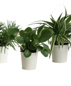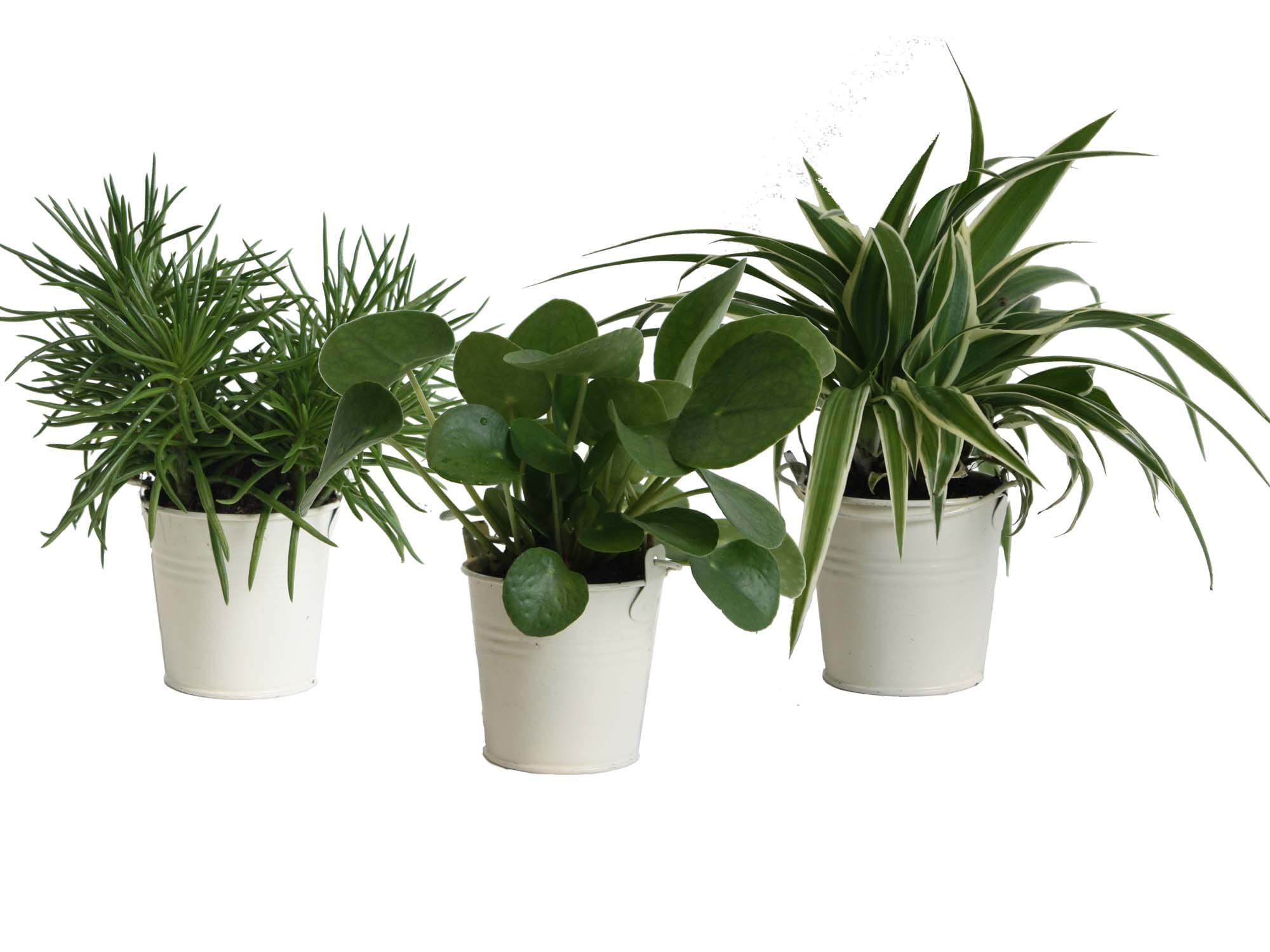 Deze mix bestaat uit: Pilea peperomioides, Senecio Himalaya en Chlorophytum Ocean