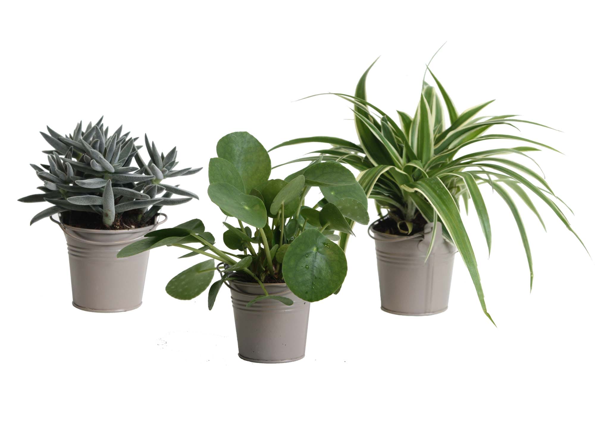 Deze mix bestaat uit: De Pilea peperomioides, van oorsprong afkomstig uit de provincie Yunnan in China, wordt ook wel de Pannenkoekplant of Chinese Muntenplant genoemd. Het is eigenlijk een ouderwetse plant die in de loop van de jaren in de vergetelheid is geraakt en nu weer helemaal in opkomst is. En terecht! Wat een superleuke plant is dit! De Crassula Tenelii, van oorsprong afkomstig uit Namibië, is een compacte plant met een bijzondere grijze kleur. De plant heeft een fijne beharing op de bladeren. In de dikke, vlezige bladeren kan water worden opgeslagen waardoor ze niet vaak water nodig hebben.