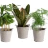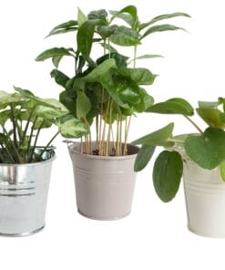 Dit trio Vrolijk Groen bestaat uit de Pannenkoekenplant (Pilea) met zijn karakteristieke glanzend groene, leerachtig, rondvormig blad, de Syngonium Pixie met zijn gekleurde blad en de prachtige donkergroene Coffea.