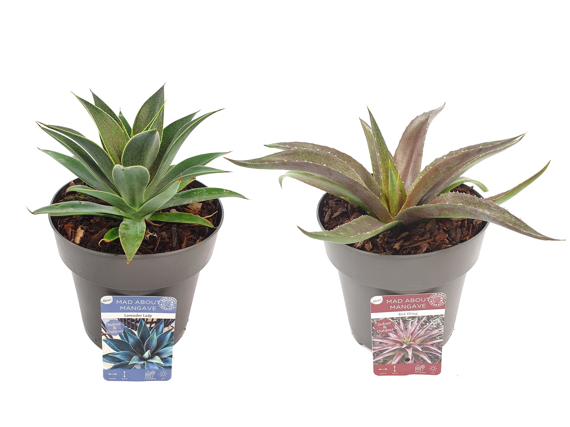 Een leuke combinatie van twee Mangaves, de Mangave ‘Lavender Lady’ en de Mangave ‘Redwing’. Geef de Mangaves een plekje in het volle licht en je geniet optimaal van de kleuren en de tekeningen van het blad. De Mangave is een kruising tussen Agave en Manfrede