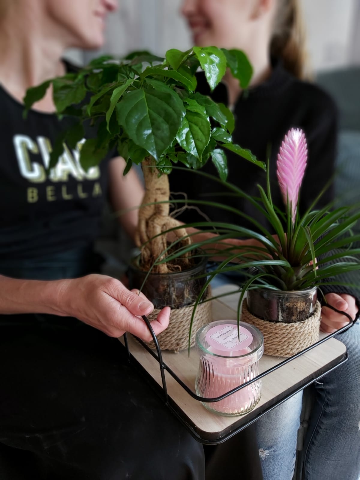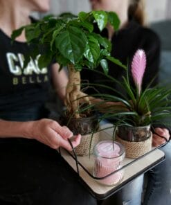 Het pakket bestaat uit twee mooie planten, een bloeiende Tillandsia en een Rademachera met luchtwortels, met een geurkaars op een hip plantenplateau. De Tillandsia is met z’n felgroene bladeren en zijn roze kam een echte blikvanger. De Rademachera heeft mooi frisgroen en glanzend blad. De planten zitten in mooie, eigentijdse glazen potten met touw.