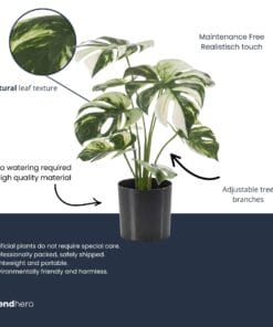 De Monstera bush kunstplant van 40 cm in pot is een compacte en stijlvolle toevoeging aan elk interieur. De herkenbare gatenbladeren en realistische vorm geven deze nepplant een moderne, botanische uitstraling. Dankzij het onderhoudsvrije karakter is deze kunstplant ideaal voor vensterbanken, bijzettafels of kantoorruimtes.