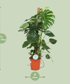 - Deze Monstera, met een huidige hoogte van ongeveer 105 cm, wordt geleverd in een pot van 24 cm.