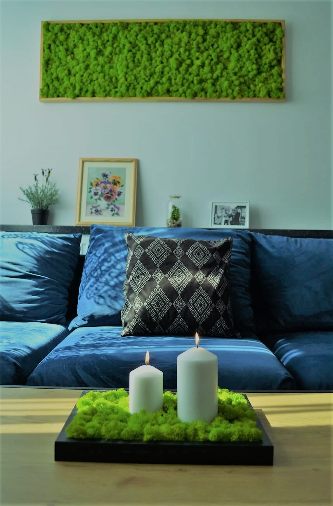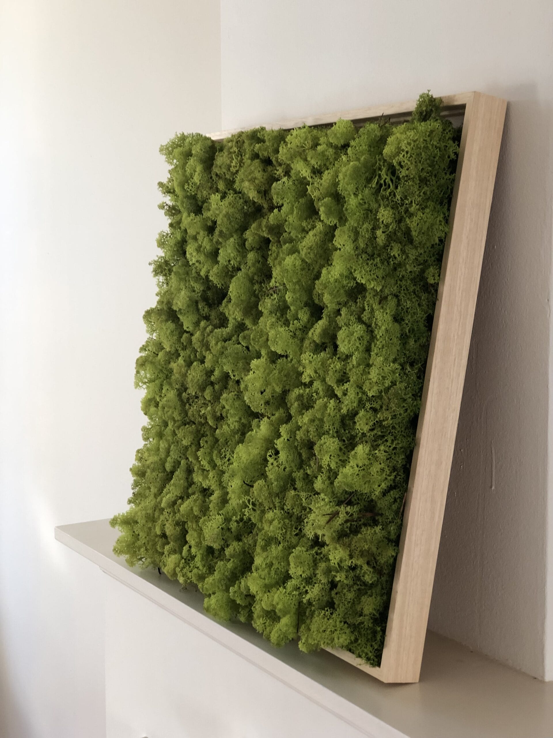 Je eigen mosschilderij met écht mos in huis! Met een duurzaam schilderij van mos breng je een echte groene eyecatcher in je woonkamer, slaapkamer, entree of kantoor. Dit mos schilderij van 100% limegroen rendiermos in een houten baklijst. Het schilderij heeft ook een geluidsdempende werking en helemaal geen onderhoud nodig. Het zorgt daarnaast voor een betere akoestiek in de ruimte. Kies je favoriete kleur en maat voor jouw eigen mosschilderij!