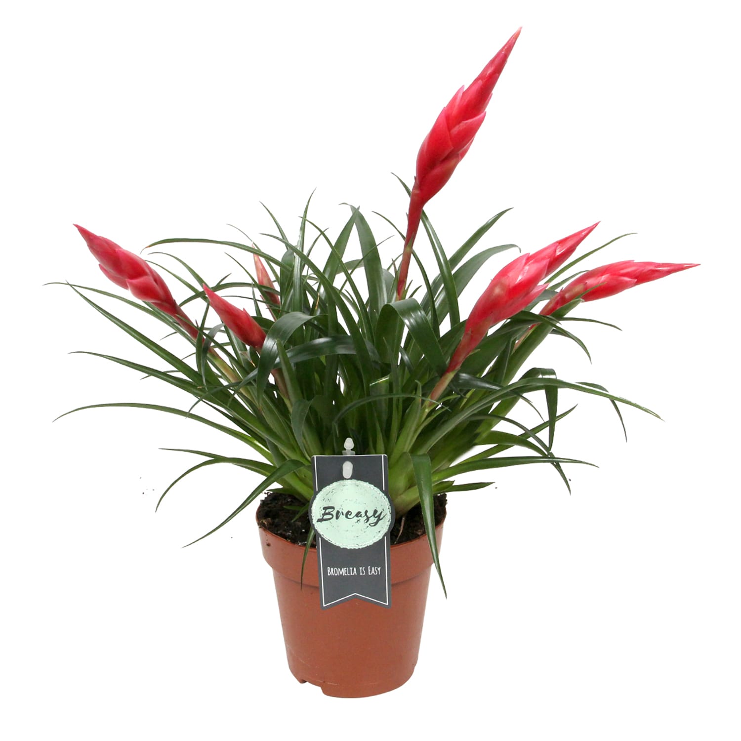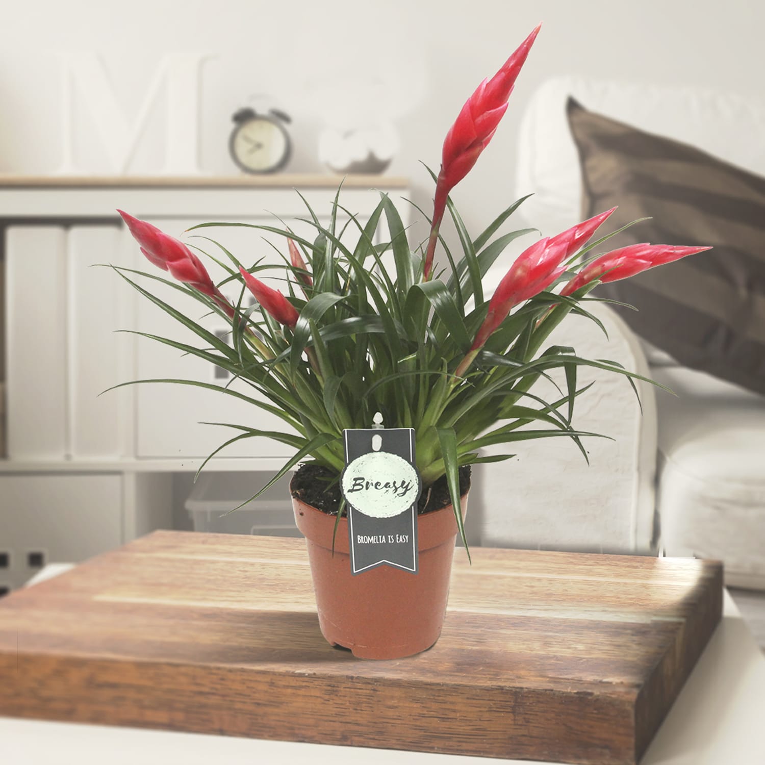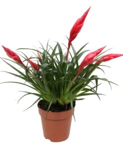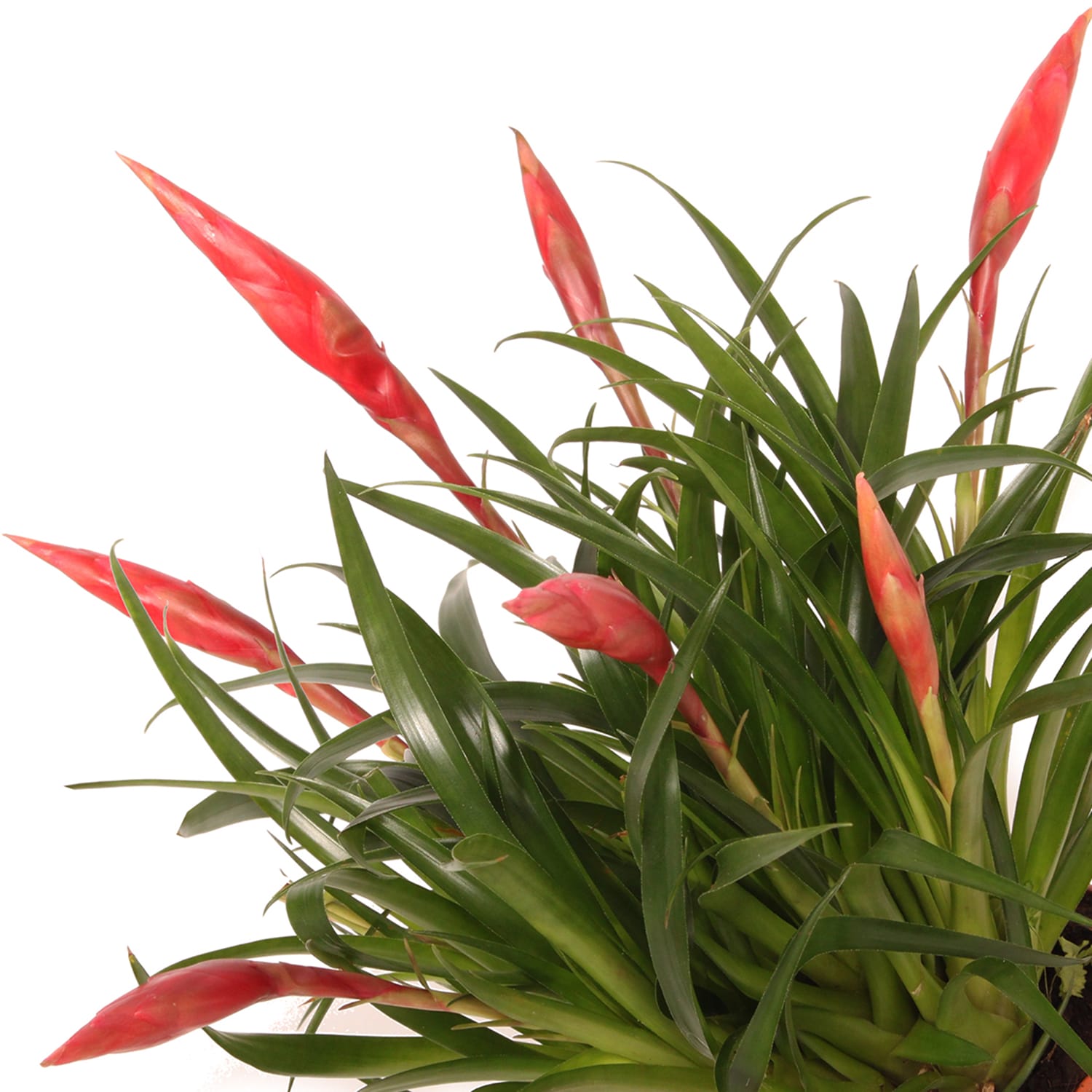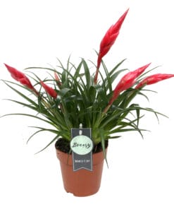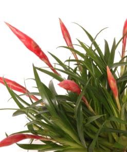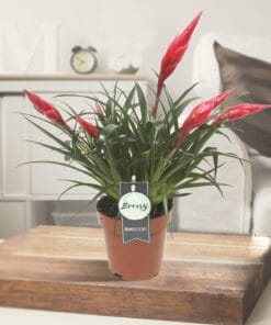 “Vriesea is een woonplant die je doet beseffen dat de natuur ook wel eens een dolle dag heeft. Hij is verkrijgbaar in oogverblindende knalkleuren als rood, oranje, geel, groen, roze, paars en wit. En in bizarre vormen zoals lange vuurpijlen, afgeplatte lepels en brede veren, die groeien uit een bladrozet.