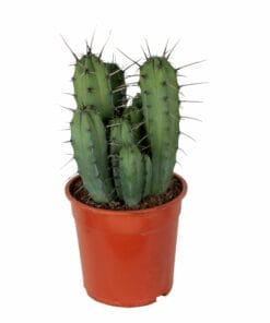Een prachtig blauw groen-gekleurde zuilcactus met lange bruine stekels. De stekels voelen zoals ze eruit zien; hard en scherp.
