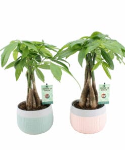 Categorieën: Binnenplanten met pot, Groene kamerplanten, Kamerplanten, Pot-plant combinaties, Pachira (Geldboom)