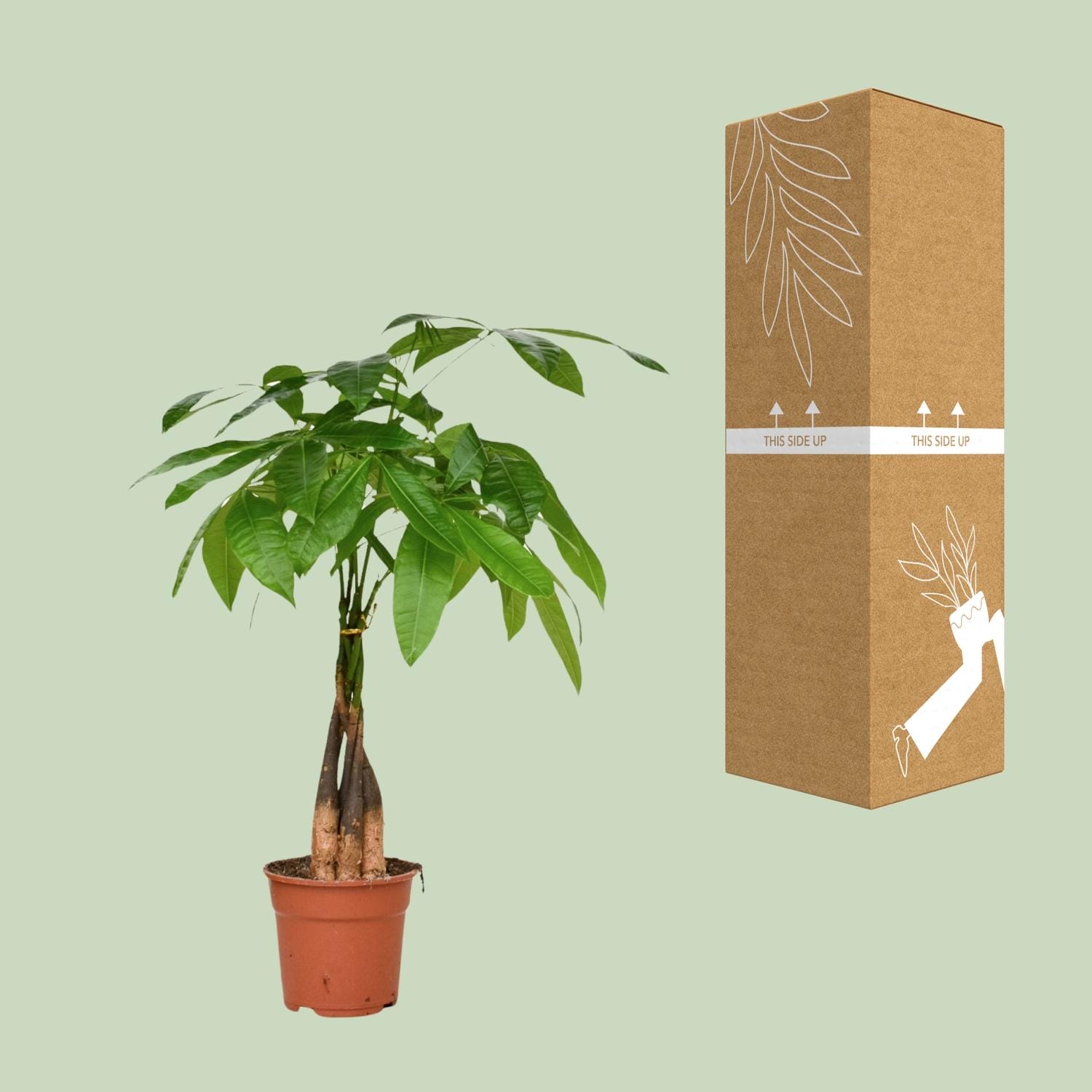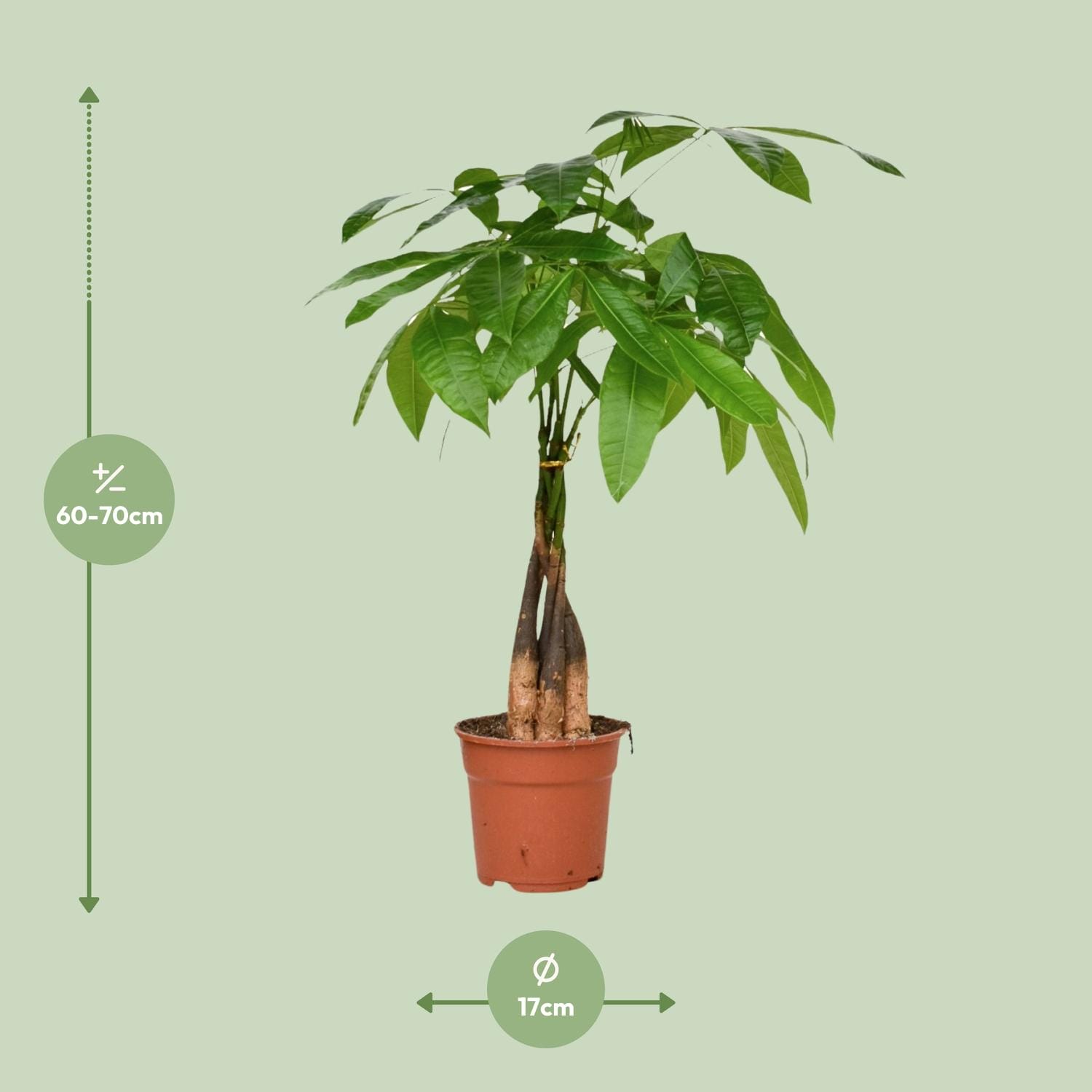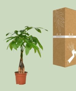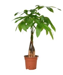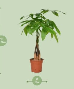 Ontdek de betoverende Pachira aquatica, ook bekend als Pachira, een prachtige kamerplant met een rijke oorsprongsverhaal. Oorspronkelijk afkomstig uit de moerassen van Centraal- en Zuid-Amerika, heeft deze majestueuze boom een buitengewone gevlochten stam en weelderige, levendige bladeren. Een symbool van geluk en voorspoed, wordt er geloofd dat de Pachira zegeningen brengt aan zijn eigenaren. Gemakkelijk te verzorgen en aanpasbaar aan verschillende lichtomstandigheden, is dit botanische juweeltje een naadloze toevoeging aan elke binnenruimte en brengt rust en sereniteit. Verrijk je interieur met de tijdloze schoonheid van de Pachira aquatica. De Pachira aquatica, ook bekend als de Geldboom, is een charmante kamerplant die een vleugje elegantie toevoegt aan elke ruimte. Deze groene schoonheid gedijt goed op een plek met halfschaduw of gedeeltelijke schaduw, waardoor het perfect is om elke hoek van de kamer op te fleuren. Om deze veerkrachtige plant gezond te houden, moet hij één keer per week water krijgen. Zijn onderhoudsvriendelijke karakter maakt het een ideale keuze voor plantenliefhebbers van alle niveaus. Investeer in de Pachira aquatica en breng welvaart en rust in uw huis of kantoor.Wist je dat de Pachira aquatica, ook wel bekend als de Geldboom, wordt geloofd om geluk en voorspoed te brengen? Deze prachtige kamerplant, vaak gekenmerkt door zijn gevlochten stam en weelderige groene bladeren, is een populaire keuze voor thuisdecoratie. Zijn levendige uitstraling zorgt voor een rustgevende sfeer, perfect voor elke leefruimte. Hoewel de Geldboom een intrigerende naam heeft, is het belangrijk om te weten dat hij puur decoratief is en niet geschikt is voor consumptie. Dus waarom breng je geen welvaart in je leven en voeg je een vleugje elegantie toe met deze charmante plant?Pachira aquatica, ook wel bekend als Pachira, is een populaire kamerplant met een potmaat van 17 cm.Deze plant groeit doorgaans tot ongeveer 65 cm hoogte, waardoor het een relatief compacte keuze is voor elke ruimte.Pachira aquatica gedijt goed in de halfschaduw en geeft de voorkeur aan een plek met gedeeltelijk zonlicht, waardoor het een veelzijdige toevoeging is aan elk huis of kantoor.Pachira aquatica staat vooral bekend om zijn gevlochten stam, wat een uniek en decoratief accent toevoegt aan zijn algehele uiterlijk.Leuk weetje: In sommige culturen gelooft men dat Pachira aquatica geluk en financiële voorspoed brengt, wat heeft geleid tot de bijnaam “geldboom.”