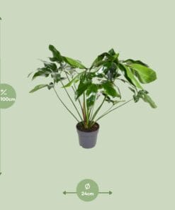 Maak kennis met onze prachtige Philodendron Green Wonder, een populaire kamerplant die een vleugje elegantie toevoegt aan elke ruimte. Ook bekend als Philodendron, komt deze weelderige schoonheid oorspronkelijk uit de tropische regenwouden van Zuid-Amerika. Met zijn glanzende, hartvormige bladeren en levendige groene kleur versterkt hij moeiteloos de sfeer van uw huis of kantoor. Gemakkelijk te verzorgen en met minimaal onderhoud, is dit een must-have voor plantenliefhebbers. Breng het wonder van de Philodendron Green Wonder naar binnen en geniet van zijn natuurlijke schoonheid. Om goed voor een Philodendron te zorgen, zoek een plek in je huis met indirect zonlicht. Deze plant gedijt goed in halfschaduw. Water het eens per week en laat de grond tussen de bewateringen door iets drogen. Philodendrons geven de voorkeur aan goed doorlatende grond, dus kies een mengsel van veenmos, perliet en potgrond. Bemest de plant elke 2-3 maanden tijdens het groeiseizoen met een evenwichtige kamerplantenmeststof. Verdun de meststof en breng het aan op vochtige grond. Vermijd overbemesting, omdat dit de plant kan beschadigen. Met deze verzorgingstips zal je Philodendron gedijen en schoonheid aan je ruimte toevoegen.Wist je dat Philodendron Green Wonder niet alleen een mooie plant is, maar ook een geweldige toevoeging aan je interieur? Deze prachtige plant, met zijn levendige groene bladeren, kan direct elke ruimte opvrolijken. Het is echter belangrijk op te merken dat hoewel deze plant verleidelijk kan lijken, hij puur decoratief is en niet eetbaar. Dus ga gerust genieten van het visuele feest dat Philodendron Green Wonder biedt, maar laat het eten over aan andere heerlijke traktaties!- Philodendron Green Wonder is een populaire kamerplant die bekend staat om zijn levendige groene bladeren.- Deze specifieke variant van de Philodendron Green Wonder komt in een potmaat van 24 cm, waardoor het geschikt is voor middelgrote ruimtes.- Met een hoogte van ongeveer 100 cm kan deze plant een vleugje elegantie en schoonheid toevoegen aan elke binnenomgeving.- Philodendron Green Wonder wordt ook vaak simpelweg Philodendron genoemd, waardoor het gemakkelijk te herkennen en identificeren is.- Deze plant geeft de voorkeur aan halfschaduwrijke gebieden, waar het indirect zonlicht kan ontvangen om te gedijen.Leuk feitje: Wist je dat Philodendrons niet alleen visueel aantrekkelijk zijn, maar ook luchtzuiverende eigenschappen hebben? Ze kunnen helpen bij het verwijderen van gifstoffen uit de binnenlucht en bevorderen zo een gezondere leefomgeving.
