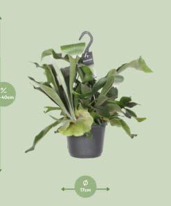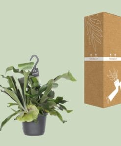 Maak kennis met de prachtige Platycerium Nederland, ook wel bekend als de Geweihertsvaren! Afkomstig uit exotische regenwouden, brengt deze kamerplant een vleugje wildernis in jouw ruimte. Met zijn levendige groene bladeren die lijken op majestueuze geweistangen, zal het zeker indruk maken op elke natuurliefhebber. Makkelijk te verzorgen, gedijt deze varen goed bij matig licht en luchtvochtigheid. Of ze nu aan muren hangen of op houten blokken worden gemonteerd, de Geweihertsvaren verfraait moeiteloos de esthetiek van elke binnenomgeving. Breng vandaag nog een stukje wildernis in huis met de verbazingwekkende Platycerium bifurcatum, de ultieme statementplant. Stel je voor, de prachtige Platycerium Nederland, een adembenemende toevoeging aan elke groene oase die belooft te betoveren met zijn unieke schoonheid. Voor deze plant zorgen is een fluitje van een cent – plaats hem gewoon op een plek waar hij gedeeltelijk in de schaduw kan staan. Om ervoor te zorgen dat hij goed gedijt, geef deze betoverende plant eens in de 8-10 dagen water. Met zijn elegante bladeren en eenvoudig onderhoud is de Platycerium Nederland een ideale keuze voor zowel ervaren plantenliefhebbers als beginners. Geniet van zijn aanwezigheid en creëer een adembenemende sfeer in jouw ruimte. Haal die van jou vandaag nog in huis!Wist je dat Platycerium Nederland, ook wel bekend als het Hertshoornvaren, niet alleen een unieke en mooie decoratieve plant is, maar ook de natuurlijke luchtzuiveraar van de natuur? Met zijn kenmerkende geweivormige bladeren absorbeert deze tropische epifyt schadelijke verontreinigende stoffen uit de lucht, waardoor het zuurstofniveau in je leefruimte wordt verhoogd. Het is echter belangrijk om te onthouden dat ondanks zijn betoverende uiterlijk, deze varen strikt voor decoratieve doeleinden is en niet om te consumeren. Laat dus dit betoverende “groene kunstwerk” je huis versieren, terwijl het de luchtkwaliteit verbetert en een vleugje natuurlijke schoonheid toevoegt!- De Platycerium Nederland, ook bekend als het Hertshoornvaren, heeft een potmaat van 17 cm.- Deze unieke plant bereikt een hoogte van ongeveer 35 cm, waardoor het een compacte en visueel aantrekkelijke toevoeging is aan elke ruimte.- Hertshoornvarens gedijen in halfschaduw, wat verwijst naar een plek met gedeeltelijke schaduw, waardoor het ideaal is voor zowel binnen- als buitenomgevingen.- Ook wel elandshoorn- of geweihorenvaren genoemd, is Platycerium bifurcatum een interessante en veelzijdige plant die een vleugje elegantie toevoegt aan elke omgeving.- Een leuk weetje over de Platycerium Nederland is dat het een epifytische varen is, wat betekent dat het kan groeien op andere planten of oppervlakken, en afhankelijk is van lucht, regenwater en afvalstoffen voor voedingsstoffen. Deze unieke aanpassing stelt het in staat om te groeien op onconventionele locaties en voegt een fascinerend element toe aan de zorg en onderhoud ervan.