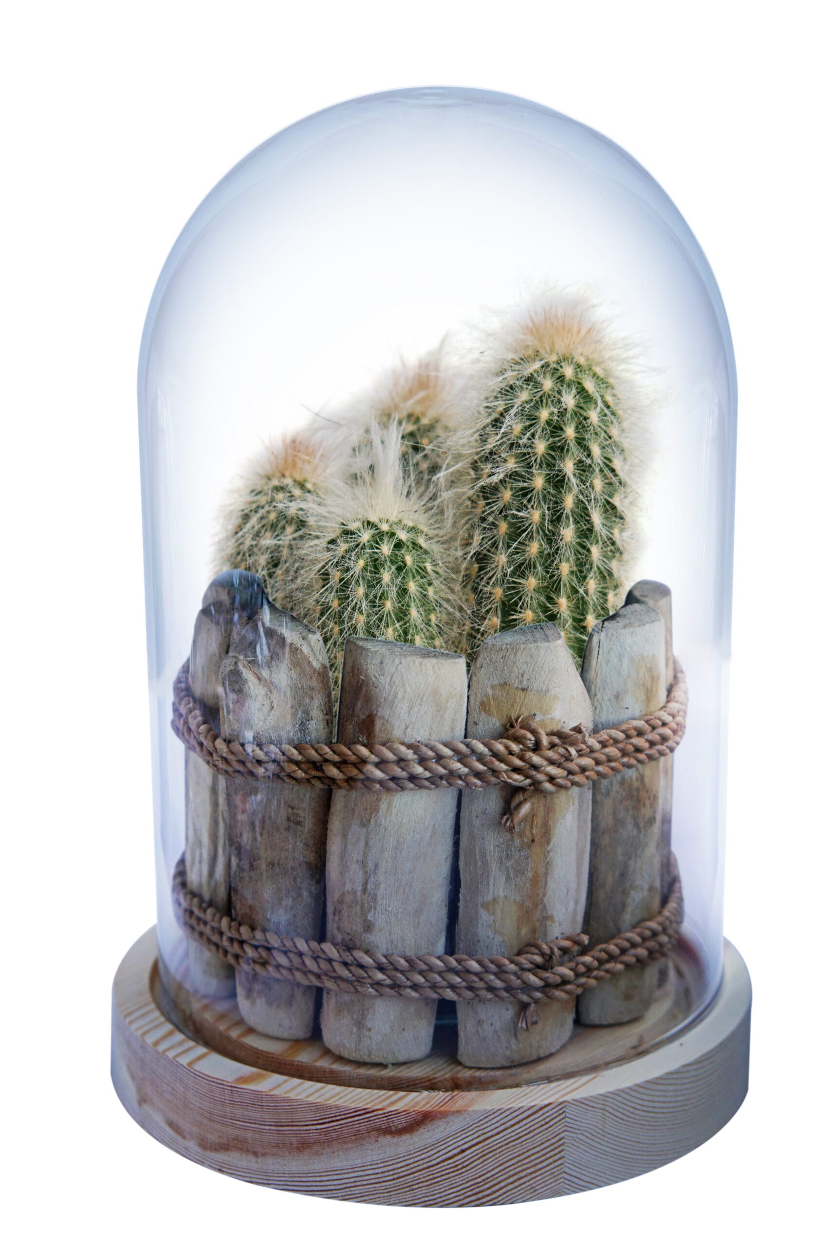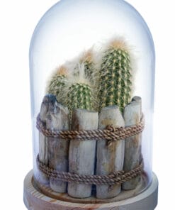 De Pseudoepostoa Melanostele is een aantrekkelijke lange, zuilvormige cactus, geleverd in een prachtige, unieke houten pot van Driftwood. Op de groene stam zitten stevige witte stekels. Zoals je op de foto ziet groeit deze cactus vaak uit meerdere stammen, of hij vertakt zichzelf. De grijze beharing bovenop geeft de cactus een uniek uiterlijk. De dichtheid van de stekels neemt toe als de cactus ouder wordt.Deze cactus wordt geleverd in een unieke glazen stolp met LED verlichting (inclusief batterij).