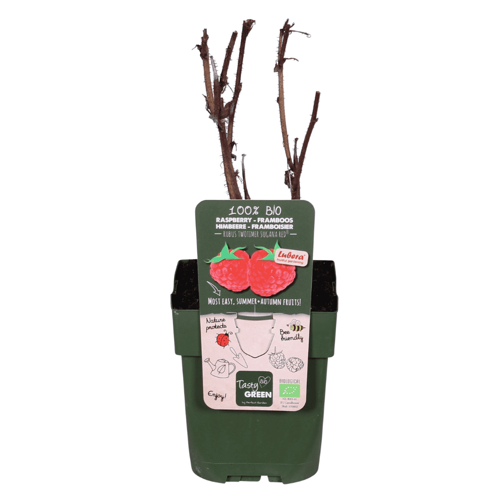 ‘Rubus Idaeus Twotimer Sugana Red’ is de enige framboos die twee keer per jaar vruchten geeft. Een echte aanwinst voor je tuin! De frambozen zijn heerlijk zoet en felrood. Ze zijn erg gezond, ze zitten vol antioxidanten, mineralen en vitaminen. De struik groeit rechtop en kan ongeveer 180 cm hoog worden. Deze soort is geschikt voor de kleinere tuinen, zelfs voor op het balkon. In juni is de eerste oogst op de oude takken van de struik, in het najaar de tweede oogst op de nieuwe takken.
