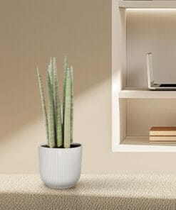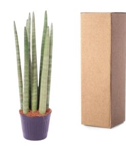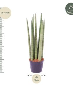 - Uiterlijk van de plant: De Sansevieria, ook wel bekend als de Vrouwentong, heeft stijve, zwaardvormige bladeren die variëren van donkergroen tot grijsgroen. De bladeren hebben vaak lichte strepen of een geelachtige rand, wat zorgt voor een modern en stijlvol uiterlijk.