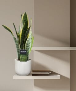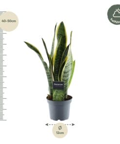 - Uiterlijk van de plant: De Sansevieria, ook wel bekend als de Vrouwentong, heeft stijve, zwaardvormige bladeren die variëren van donkergroen tot grijsgroen. De bladeren hebben vaak lichte strepen of een geelachtige rand, wat zorgt voor een modern en stijlvol uiterlijk.