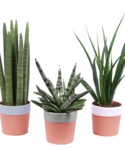 De Sansevieria of vrouwentong is een gemakkelijke plant. Deze set van drie Sansevieria in leuke sierpotten van keramiek heeft niet veel water nodig en stelt verder ook weinig eisen.
