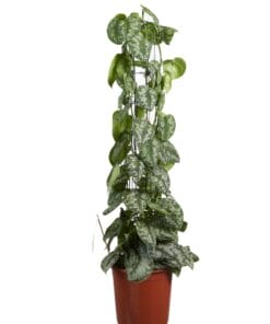 De Scindapsus Trebie is een groene klimplant afkomstig uit zuidoost Azië. Heel opvallend aan deze plant is de mooie hartvorm van het blad en het donkere groen met de zilverkleurige vlekken. Het is een vrij makkelijke plant om te verzorgen: zorg voor een geschikt plekje in huis en geef op tijd water. Deze plant klimt omhoog over een mosstok in een pot van 27cm diameter. Deze Scindapsus is een van de planten die de lucht in huis het beste kan zuiveren! Dat betekent dat hij niet alleen CO2 omzet in zuurstof, maar dat hij ook allerlei schadelijke stoffen uit de lucht haalt. Perfect voor woningen in de stad en voor huizen met weinig ventilatie!