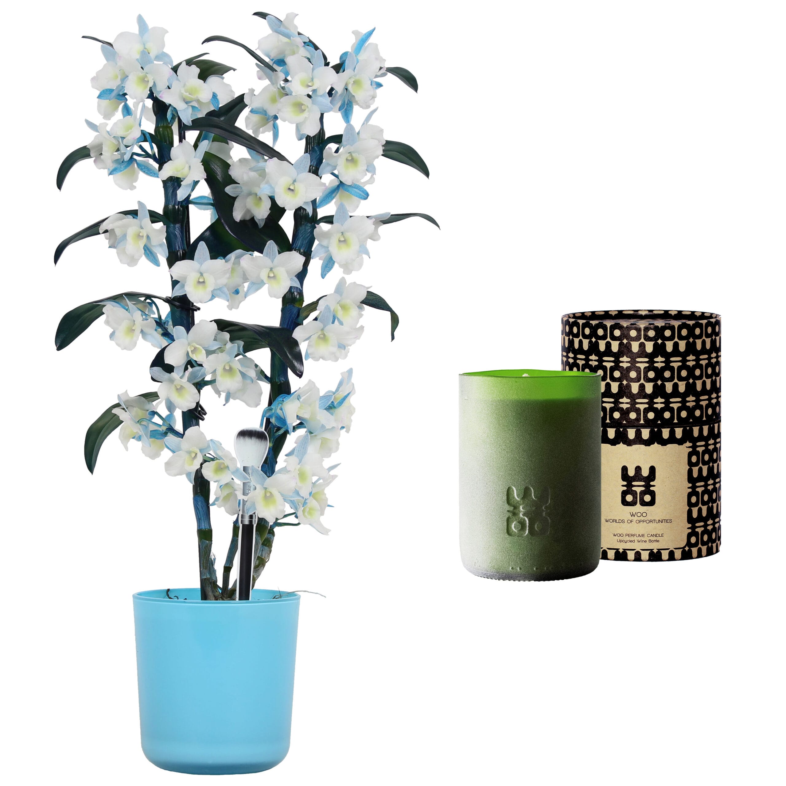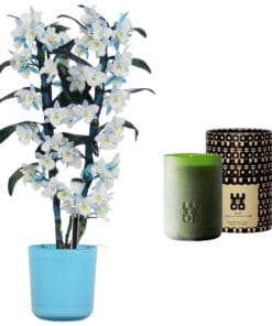 De Bamboo Orchid ‘Make Upz’ Blue is vanwege haar prachtige kleuren extra feestelijk. In combinatie met deze ‘ Lucky Candle Green’ wordt het een sieraad voor jouw interieur.