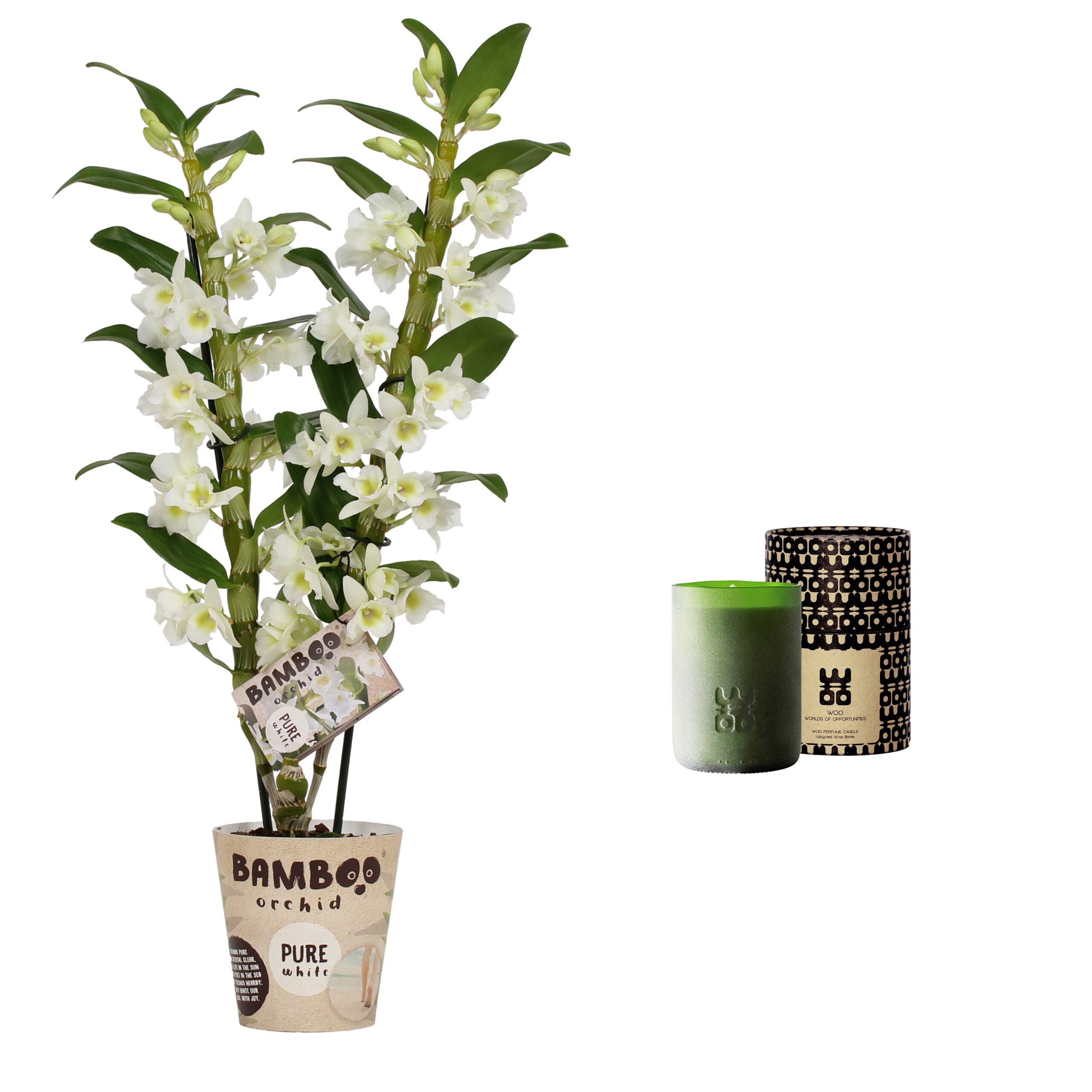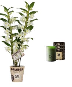 De Bamboo Orchid ‘Pure White Appolon’ heeft met haar witte bloemen een serene uitstraling. In combinatie met deze ‘ Lucky Candle Green’ wordt het een sieraad voor jouw interieur.