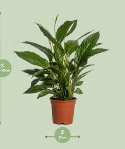 De Spathiphyllum Vivaldi, ook bekend als Peace Lily, is een elegante kamerplant die bekend staat om zijn prachtige schoonheid en luchtzuiverende eigenschappen. Afkomstig uit de tropische regenwouden van Centraal- en Zuid-Amerika, gedijt deze plant goed in de aangename sfeer van binnenruimtes. Met zijn glanzende groene bladeren en delicate witte bloemen voegt deze veerkrachtige plant een vleugje sereniteit toe aan elke ruimte. De Spathiphyllum Vivaldi is de perfecte keuze voor mensen die op zoek zijn naar een onderhoudsarme, visueel aantrekkelijke kamerplant die moeiteloos de sfeer versterkt en de lucht zuivert van gifstoffen. De Spathiphyllum Vivaldi, ook wel bekend als de Vredeslelie, is een indrukwekkende kamerplant die een vleugje elegantie toevoegt aan elke ruimte. Deze onderhoudsarme plant gedijt goed op een plek met halfschaduw en geniet van helder, indirect licht. Plaats hem simpelweg in de buurt van een raam waar hij gefilterd zonlicht kan ontvangen. Wat betreft water geven, geeft de Spathiphyllum Vivaldi de voorkeur aan een wekelijks watergeefschema, waarbij de grond tussen de gietbeurten iets kan opdrogen. Met zijn weelderige groene bladeren en delicate witte bloemen zal deze plant zeker rust en schoonheid in je huis brengen met minimale inspanning vereist.Wist je dat de Spathiphyllum Vivaldi, ook bekend als de Peace Lily, niet alleen een mooie decoratieve plant is, maar ook dienst doet als een natuurlijke luchtzuiveraar? Met zijn weelderige donkergroene bladeren en elegante witte bloemen voegt deze populaire kamerplant een vleugje sereniteit toe aan elke ruimte. Het is echter verleidelijk om te genieten van zijn prachtige schoonheid, maar onthoud alsjeblieft dat de Peace Lily bedoeld is om bewonderd te worden, niet om te eten. Dus, houd dit kleine groene vriendje dichtbij om te genieten van de esthetische voordelen en de frissere lucht die het brengt, maar onthoud om het uit je saladekom te laten!- Spathiphyllum Vivaldi is een variëteit van Spathiphyllum, algemeen bekend als de Peace Lily.- Deze plant heeft een potmaat van 17 cm en bereikt een hoogte van ongeveer 70 cm.- Spathiphyllum Vivaldi gedijt op een plek met gedeeltelijke schaduw.- Een leuke feit over Spathiphyllum is dat het niet alleen een mooie kamerplant is, maar ook dient als een natuurlijke luchtzuiveraar, het verwijderen van gifstoffen uit de lucht.- Spathiphyllum Vivaldi brengt een vleugje elegantie en rust in elke binnenruimte, waardoor het een populaire keuze is voor zowel thuis als op kantoor.
