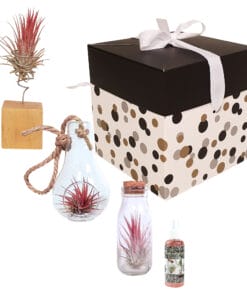 Tillandsia’s zijn erg leuk als decoratie en daarom ook leuk om cadeau te geven. Daarom versturen wij dit arrangement van drie tillandsia’s in een cadeauverpakking. En natuurlijk is er een verzorgingsspray bijgesloten.