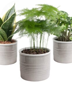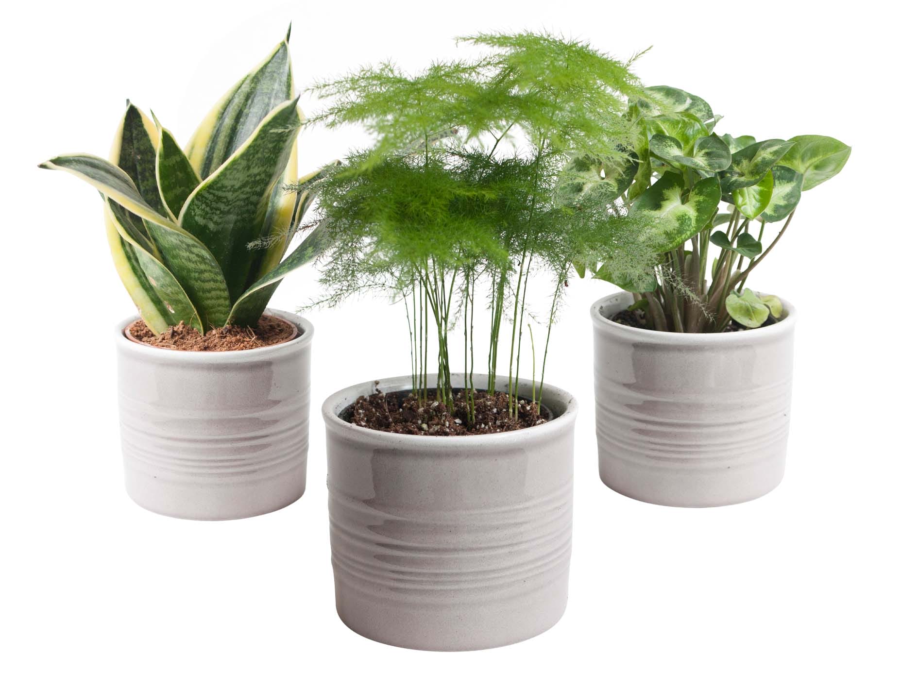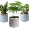 Dit sterke trio kamerplanten bestaat uit de Asparagus, de Sanseveria en de Syngonium Pixie. De Asparagus of sierasperge heeft zachte groene pluimen en is een snelle groeier. Deze robuuste, decoratieve kamerplant heeft door zijn fijne naaldachtige blaadjes een zacht uiterlijk en vraagt weinig verzorging. De Syngonium Pixie heeft kleine bonte blaadjes met een mooie bladschakering.
