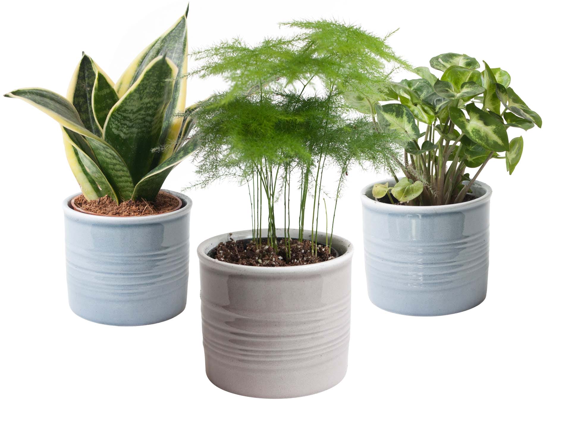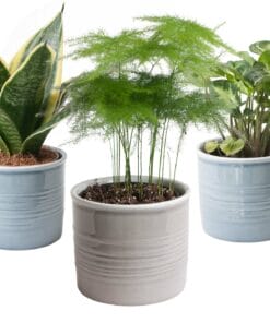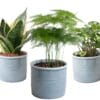 Dit sterke trio kamerplanten bestaat uit de Asparagus, de Sanseveria en de Syngonium Pixie. De Asparagus of sierasperge heeft zachte groene pluimen en is een snelle groeier. Deze robuuste, decoratieve kamerplant heeft door zijn fijne naaldachtige blaadjes een zacht uiterlijk en vraagt weinig verzorging. De Syngonium Pixie heeft kleine bonte blaadjes met een mooie bladschakering.