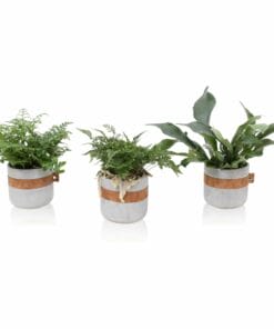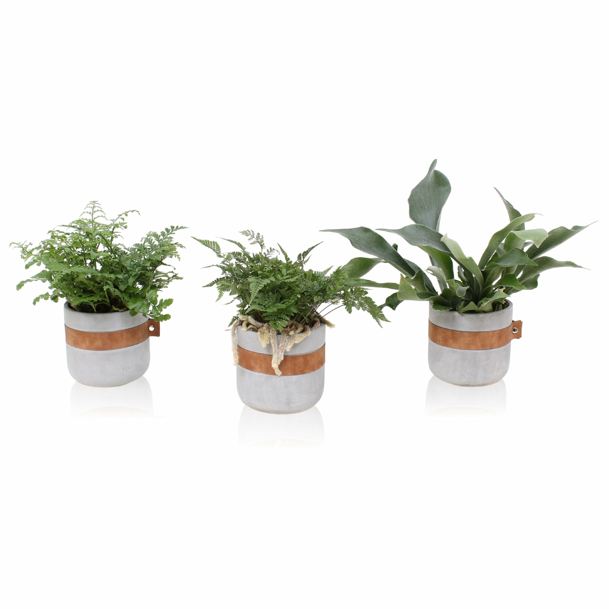 Een mix van drie varens in een sierpot van beton met een lederen band geeft dit trio een robuuste uitstraling. De varen is een decoratieve oerplant. De weelderige bladeren – gekruld, geveerd of glad – maken dit trio ideaal voor jouw urban jungle.