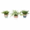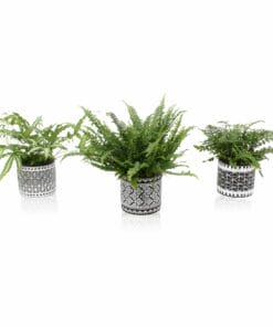Een mix van drie varens in een zwart witte keramiek sierpot band geeft dit trio een moderne uitstraling. De varen is een decoratieve oerplant. De weelderige bladeren – gekruld, geveerd of glad – maken dit trio ideaal voor jouw urban jungle.
