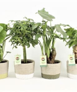 De Alocasia Cucullata wordt gekenmerkt door mooie pijlvormige groene bladeren en een opvallend compacte groei. De Schefflera die door zijn aparte bladeren Vingersboom genoemd wordt is een erg sterke plant en vraagt nauwelijks aandacht. De Monstera Deliciosa wordt dankzij de speciale vorm van de bladeren ook wel gatenplant genoemd. Deze hippe plant is een bron van inspiratie in de mode- en kunstwereld. De Radermachera Sinica komt oorspronkelijk uit China en Taiwan. De plant is erg decoratief vanwege de hoge luchtwortels.