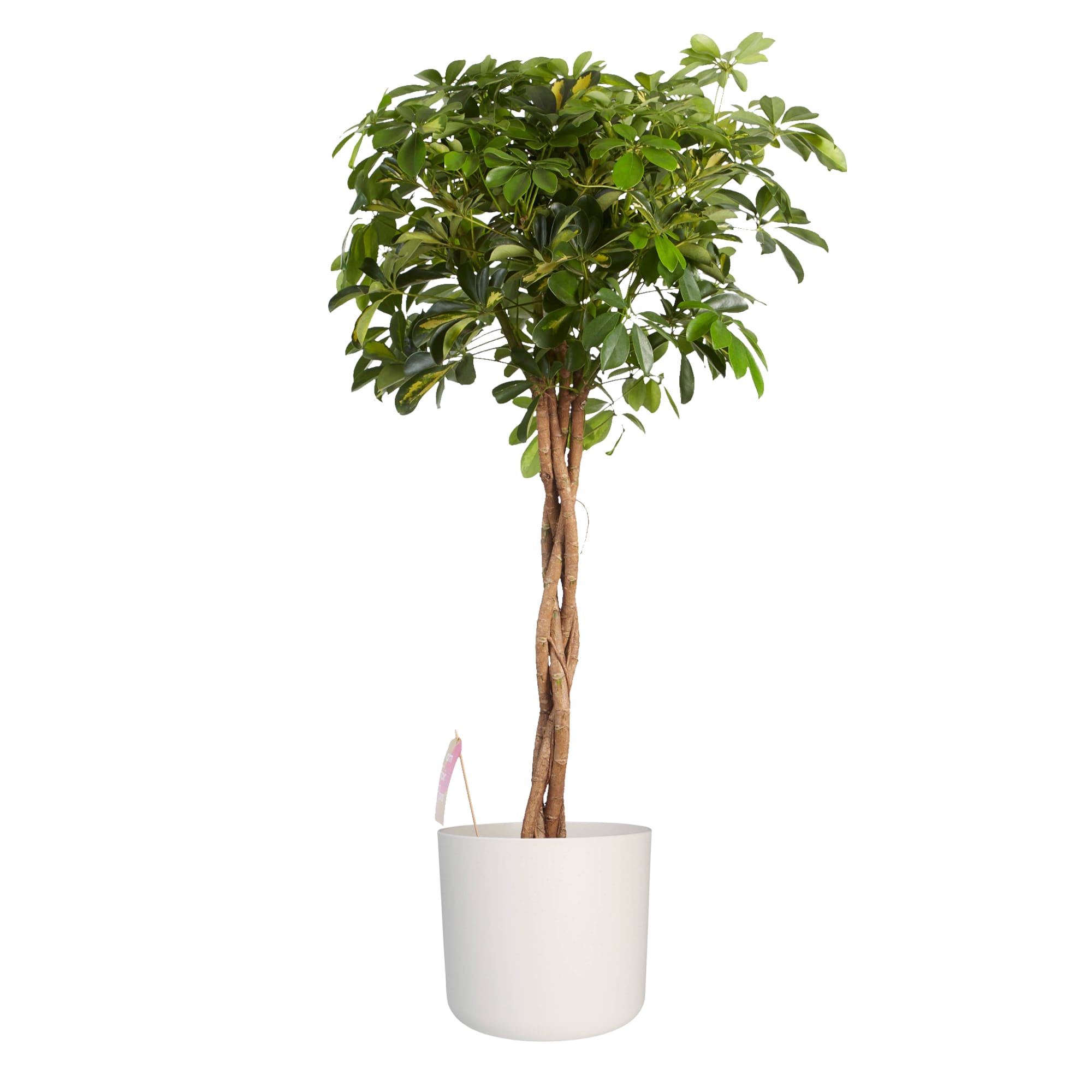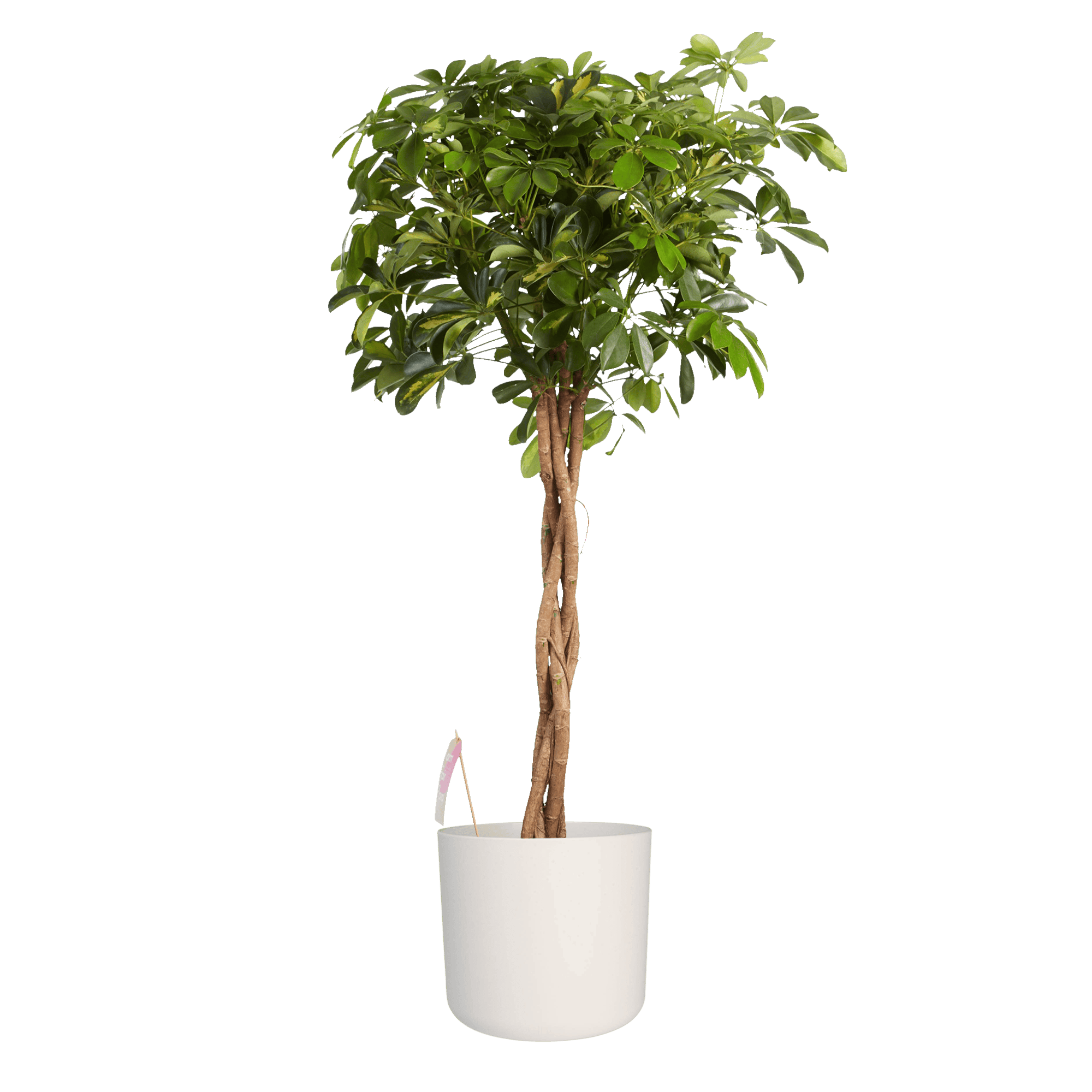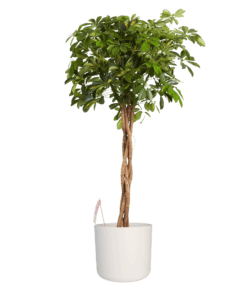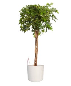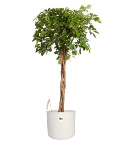De Schefflera wordt ook wel vingersboom genoemd, door de karakteristieke vorm van de bladeren. De De Gold Capella heeft donkere bladeren met “gouden” accenten. De plant ziet er wat meer uit als een boom, met duidelijk zichtbare stammen en een kruin. Het is geen heel moeilijke plant om te verzorgen: zorg voor een lichte plek en geef af en toe wat water. Deze plant groeit in een pot van 27cm diameter. Een Schefflera is makkelijk te verzorgen, doordat hij niet continu in vochtige aarde hoeft te staan. Daarnaast kan de Schefflera ook veel licht verdragen. Een makkelijke plant dus, geschikt voor die lastige zonnige plek!