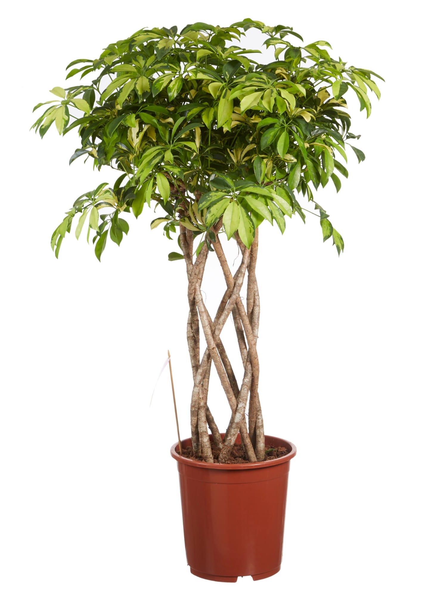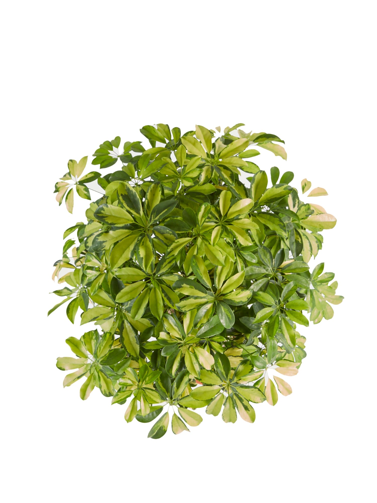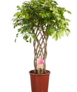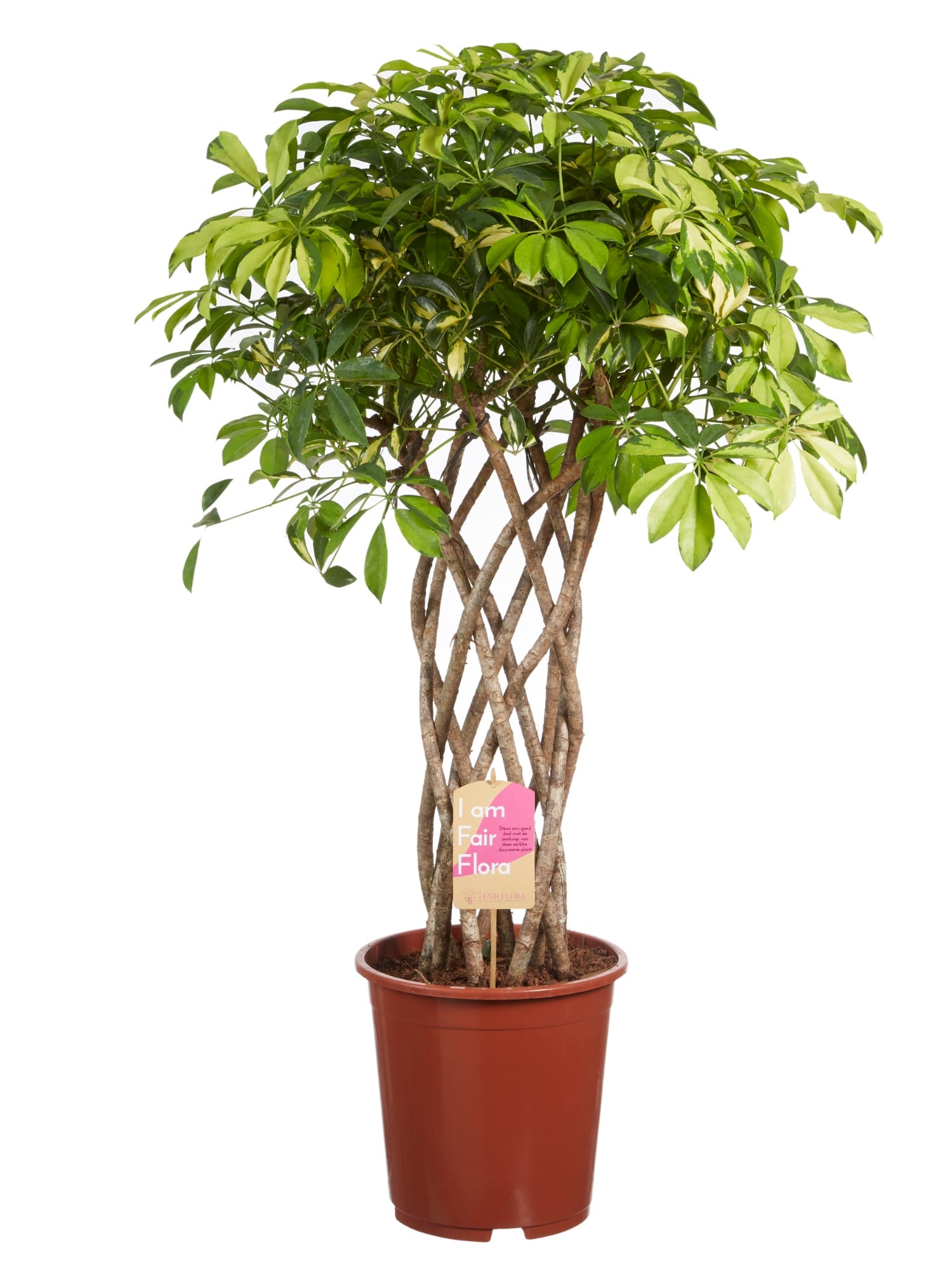 De Schefflera wordt ook wel vingersboom genoemd, door de karakteristieke vorm van de bladeren. De Trinette heeft mooie bonte bladeren en bij deze plant zijn de stammen tot een koker gevlochten. De plant ziet er wat meer uit als een boom, met duidelijk zichtbare stammen en een kruin. Het is geen heel moeilijke plant om te verzorgen: zorg voor een lichte plek en geef af en toe wat water. Deze plant groeit in een pot van 27cm diameter. Een Schefflera is makkelijk te verzorgen, doordat hij niet continu in vochtige aarde hoeft te staan. Daarnaast kan de Schefflera ook veel licht verdragen. Een makkelijke plant dus, geschikt voor die lastige zonnige plek!