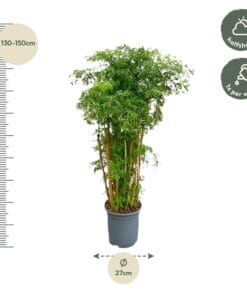 Polyscias Ming, ook bekend als de Ming Aralia, voegt een vleugje elegante pracht toe aan binnen- en buitenruimtes. Met zijn fijn vertakte bladeren en compacte, bossige groei, creëert de Polyscias Ming direct een gevoel van verfijning en botanische schoonheid. Deze plant gedijt goed in helder indirect licht en matig vochtige omstandigheden, waardoor hij ideaal is voor diverse interieur- en landschapsontwerpen. Naast zijn esthetische aantrekkingskracht fungeert de Polyscias Ming ook als een luchtzuiveraar, waardoor de kwaliteit van de leefomgeving wordt verbeterd. Met zijn compacte formaat en gemakkelijke verzorgingseisen is de Polyscias Ming een favoriet onder liefhebbers van sierlijke en onderhoudsvriendelijke planten.