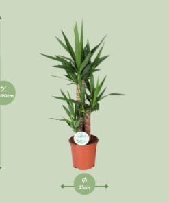 Deze Yucca wordt geleverd in een formaat van 21 cm, waardoor het ideaal is voor kleine ruimtes of binnenhuisdecoraties.De huidige hoogte van deze Yucca is ongeveer 90 cm, wat zorgt voor een volwassen en gevestigde plant.Het liefst geplaatst op een plek met halfschaduw, gedijt deze Yucca goed in omgevingen met evenwichtig zonlicht.Het verzorgen van een Yucca is ontzettend gemakkelijk, want het vereist minimaal onderhoud en kan zich aanpassen aan verschillende omstandigheden.Met zijn prachtige uitstraling heeft de Yucca lange, scherpe groene bladeren die een vleugje elegantie toevoegen aan elke ruimte.